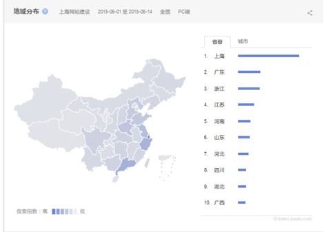 熱點(diǎn)趨勢(shì)圖顯示的是上海網(wǎng)站建設(shè)在近30天內(nèi)每天的搜索走勢(shì)。2015年6月14日有接近490的搜索指數(shù)。